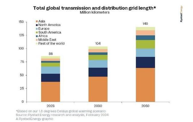 全球所有輸電和配電網(wǎng)絡(luò)的總長度約為8600萬公里,這一距離足以環(huán)繞地球2100多次。輸電網(wǎng)包括600萬公里的高壓線路(70千伏以上)。相比之下,更大的配電網(wǎng)由約800萬公里的中壓(10至70千伏)線路和龐大的低壓(不到10千伏)輸電網(wǎng)組成,穿越約7200萬公里,覆蓋世界各地的家庭。到2030年,電網(wǎng)長度將擴(kuò)大到1.04億公里,到2050年將擴(kuò)大到1.4億公里。亞洲將在本十年內(nèi)貢獻(xiàn)全球新增電力的一半以上,中國和印度將成為世界第一和第三大電力消費國。