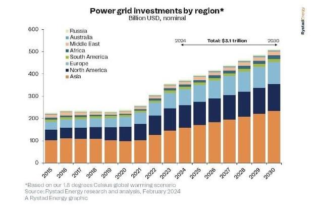 可再生能源的發(fā)展仍在以驚人的速度進(jìn)行,2024年將有6440億美元用于新增產(chǎn)能,但過時和不足的電網(wǎng)可能會成為能源轉(zhuǎn)型的重大障礙。根據(jù)Rystad Energy的研究,如果世界要將全球變暖限制在比工業(yè)化前水平高1.8攝氏度的范圍內(nèi),那么在2030年之前需要3.1萬億美元的電網(wǎng)基礎(chǔ)設(shè)施投資。