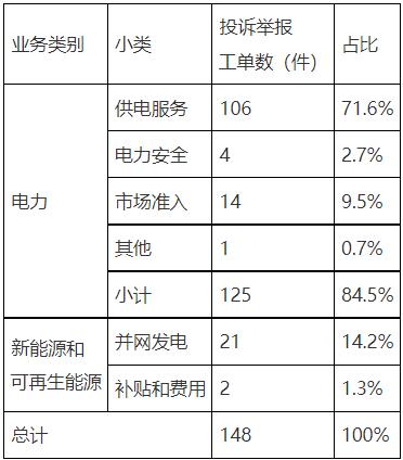 2022年9月份工單中,投訴和舉報類工單共148件,同比增加54.2%,環(huán)比減少31.5%。從反映內(nèi)容看,電力類125件,占84.5%,新能源和可再生能源類23件。具體情況見表6。