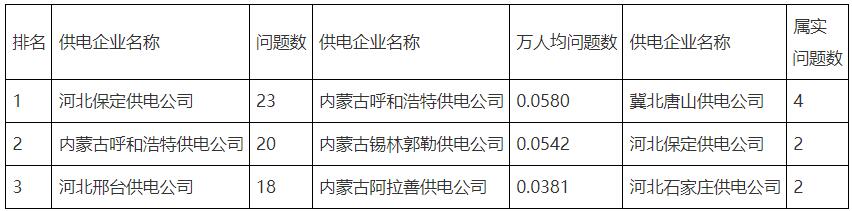 從反映供電企業(yè)問題的數(shù)量看,河北保定供電公司數(shù)量最多;從萬人均反映問題數(shù)量來看,內(nèi)蒙古呼和浩特供電公司最多。辦結(jié)的工單中(含往月結(jié)轉(zhuǎn))共12個屬實(或部分屬實)問題。2022年9月份反映供電企業(yè)問題的工單數(shù)量排名情況見表9 。
