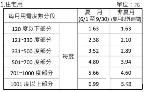一般家庭由于用電量較少且低谷時段(22:30-07:30)用電量不多,故多采用階梯電價計費。以夏月為例,假設每月用電433度,其中的120度每度電價為1.63元新臺幣(與非夏月單價一致),121度-330度部分對應每度2.38元新臺幣,剩余103度對應3.52元新臺幣,逐級增加。簡言之,用電量越大、單價越高。