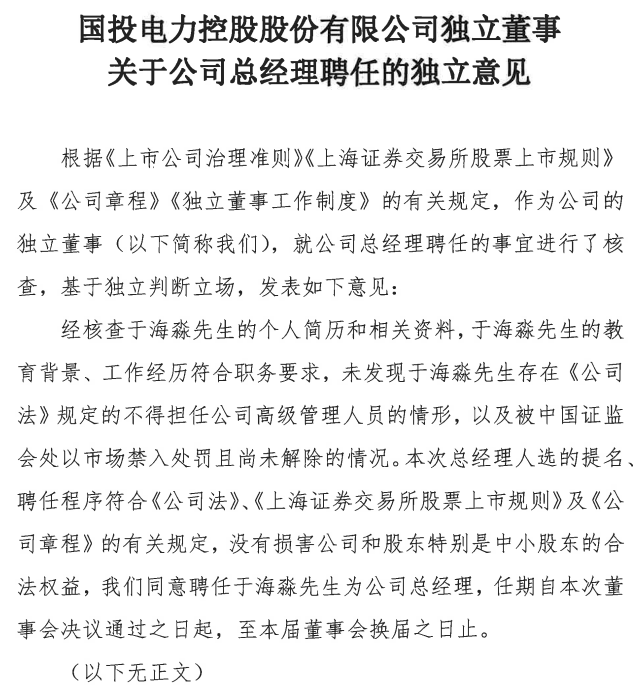 《意見》指出,國投電力同意聘任于海淼先生為公司總經(jīng)理,任期自本次董事會(huì)決議通過之日起,至本屆董事會(huì)換屆之日止。