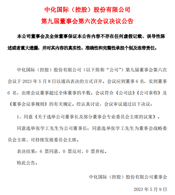 同日,中化國際發(fā)布公告,同意選舉張學工為公司董事長;同意選舉張學工為董事會戰(zhàn)略委員會主席、可持續(xù)發(fā)展委員會主席。