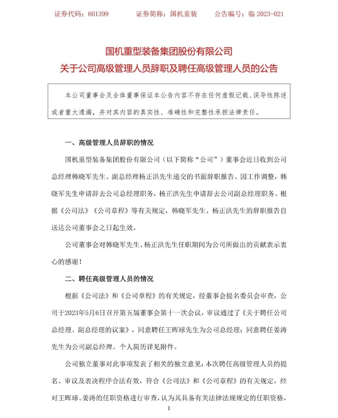 5月8日,國機(jī)重裝發(fā)布公告,董事會近日收到公司總經(jīng)理韓曉軍、副總經(jīng)理?xiàng)钫檫f交的書面辭職報(bào)告。因工作調(diào)整,韓曉軍申請辭去公司總經(jīng)理職務(wù),楊正洪申請辭去公司副總經(jīng)理職務(wù)。