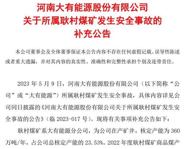 公告顯示,耿村煤礦系大有能源分公司,為公司在產礦井,核定產能為 360 萬噸/年,占公司總核定產能的 23.53%。2022 年度耿村煤礦商品煤產 量 287.45 萬噸,營業(yè)收入 13.22 億元,分別占公司同期商品煤產量 的 24.83%和營業(yè)收入的 15.39%。2023 年第一季度耿村煤礦商品煤產 量 51.51 萬噸,營業(yè)收入 2.15 億元,分別占公司同期商品煤產量的 18.32%和營業(yè)收入的 10.73%。目前,耿村煤礦正在組織實施停產救援,對公司造成的影響暫無法預測。公司將持續(xù)關注事故后續(xù)進展并及時履行信息披露義務,敬請廣大投資者注意投資風險。