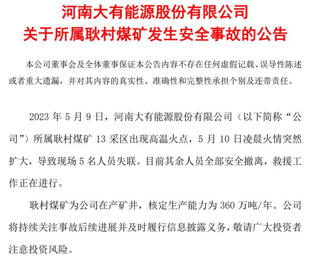 5月10日晚間大有能源公告,2023年5月9日,公司所屬耿村煤礦13采區(qū)出現高溫火點,5月10日凌晨火情突然擴大,導致現場5名人員失聯。目前其余人員全部安全撤離,救援工作正在進行。