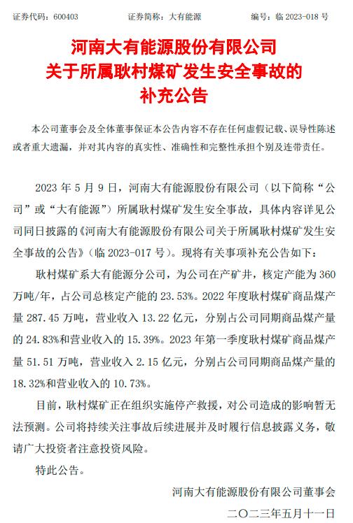 2023年5月9日,河南大有能源股份有限公司耿村煤礦13采區(qū)出現高溫火點,5月10日凌晨火情突然擴大,導致現場5名人員失聯。