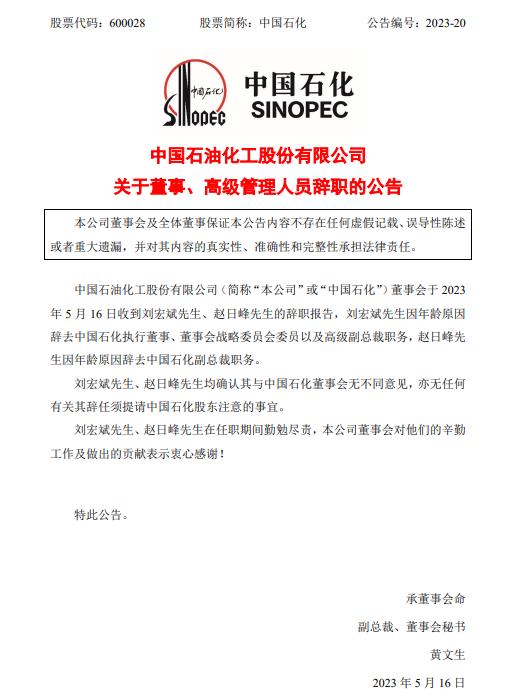 5月16日,中國石化發(fā)布公告,中國石油化工股份有限公司董事會于5月16日收到劉宏斌先生、趙日峰先生的辭職報告,劉宏斌先生因年齡原因辭去中國石化執(zhí)行董事、董事會戰(zhàn)略委員會委員以及高級副總裁職務,趙日峰先生因年齡原因辭去中國石化副總裁職務。