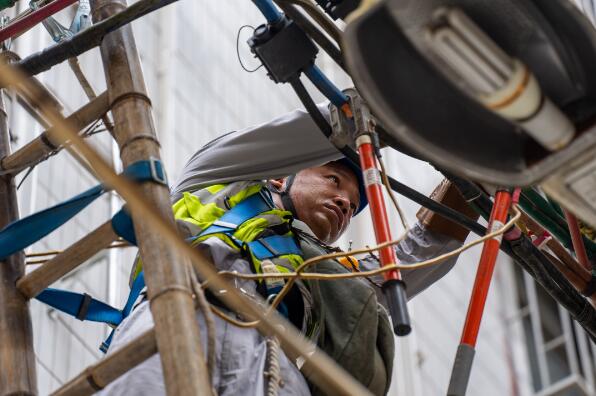 南方電網(wǎng)深圳龍崗供電局工作人員為城中村更換線路,迎接即將到來的夏季負(fù)荷高峰。