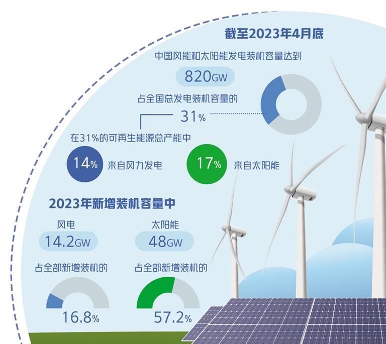 數(shù)據(jù)顯示,截至2023年4月底,中國風(fēng)能和太陽能發(fā)電裝機容量達到820吉瓦(GW),占全國總發(fā)電裝機容量的31%。在31%的可再生能源總產(chǎn)能中,14%來自風(fēng)力發(fā)電,17%來自太陽能。2023年新增裝機容量中,風(fēng)電14.2GW,太陽能48GW,分別占全部新增裝機的16.8%和57.2%。這意味著可再生能源裝機容量同比增長11.5%。