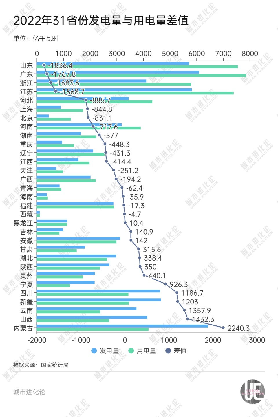 若以“發(fā)電量-用電量”來評估各省份發(fā)電凈貢獻和電力缺口,2022年,山東的差值為-1836.4億千瓦時,凈貢獻從前一年全國倒數(shù)第三跌至倒數(shù)第一。