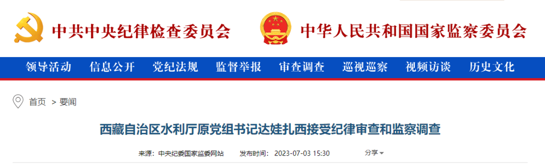 中央紀委國家監(jiān)委網(wǎng)站7月3日消息,據(jù)西藏自治區(qū)紀委監(jiān)委消息:西藏自治區(qū)水利廳原黨組書記達娃扎西涉嫌嚴重違紀違法,目前正接受西藏自治區(qū)紀委監(jiān)委紀律審查和監(jiān)察調(diào)查。