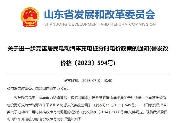 山東省發(fā)改委2023年7月31日發(fā)布《關于進一步完善居民電動汽車充電樁分時電價政策的通知》