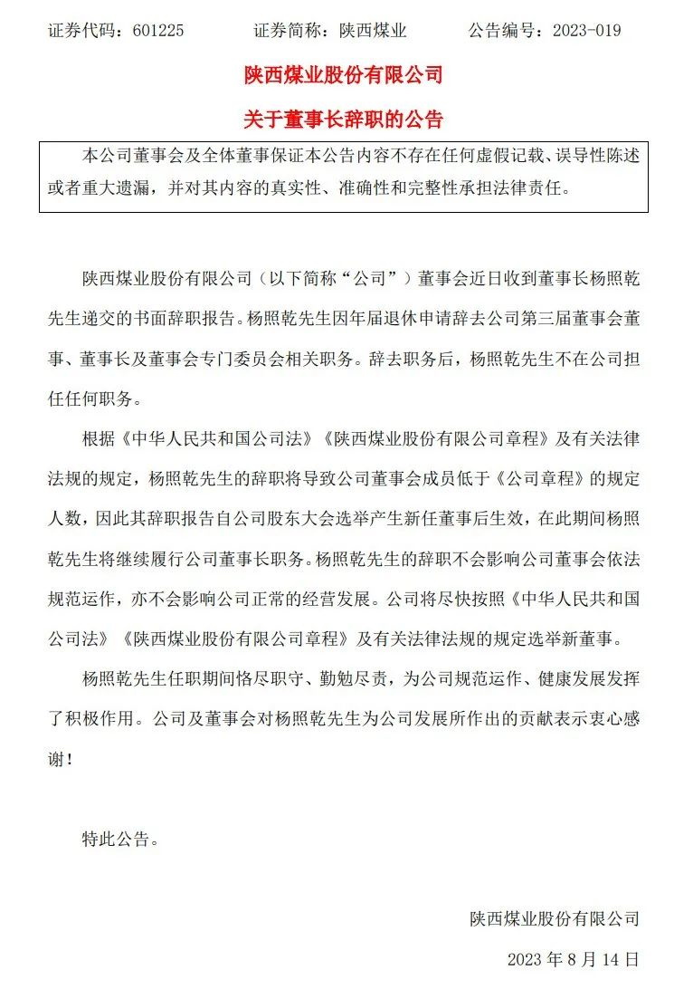 陜西煤業(yè)公告,公司董事會近日收到董事長楊照乾遞交的書面辭職報告。楊照乾因年屆退休申請辭去公司第三屆董事會董事、董事長及董事會專門委員會相關(guān)職務(wù)。