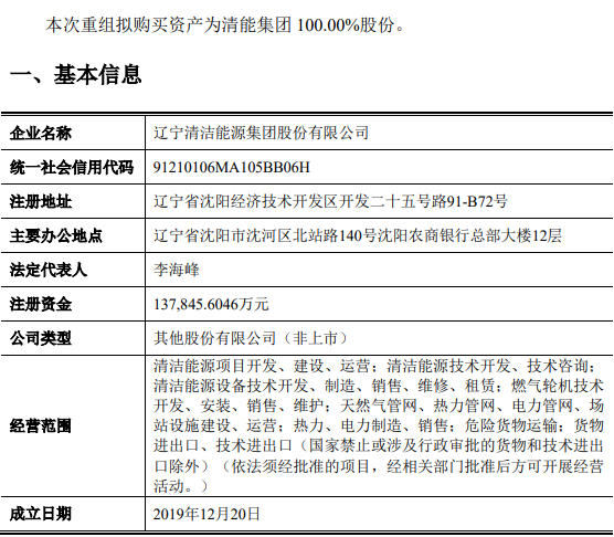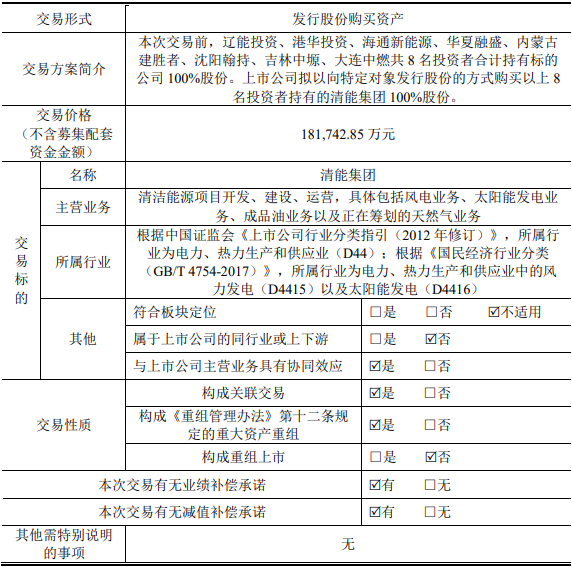根據(jù)此前公告披露,遼寧能源擬作價(jià)18.17億元,以發(fā)行股份的方式收購遼能投資、港華投資、海通新能源等共8名投資者合計(jì)持有的遼寧清潔能源集團(tuán)(簡稱:清能集團(tuán))100%股份,并募集配套資金10億元,用于遼能康平300MW風(fēng)電項(xiàng)目、遼能南票200MW風(fēng)電項(xiàng)目、償還上市公司債務(wù)。