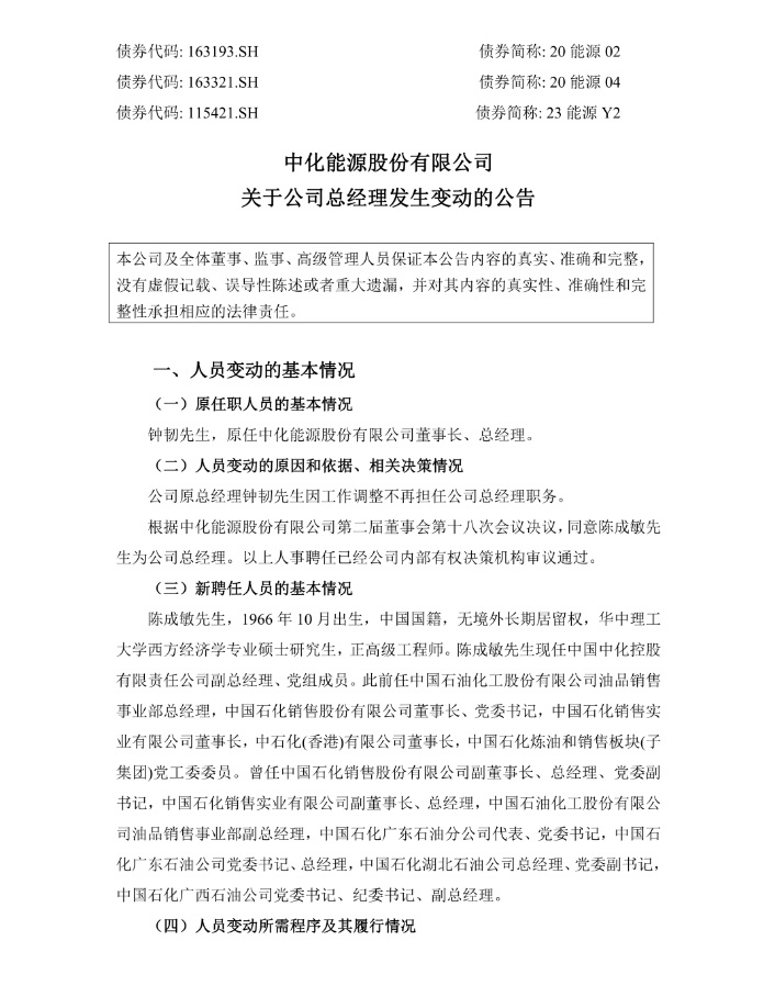 近期,中化能源股份有限公司發(fā)布公告,中化能源股份有限公司原總經(jīng)理鐘韌因工作調(diào)整不再擔(dān)任公司總經(jīng)理職務(wù)。