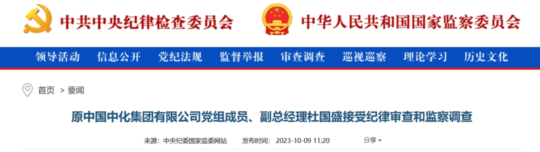 中央紀(jì)委國(guó)家監(jiān)委網(wǎng)站10月9日消息,據(jù)中國(guó)中化控股有限責(zé)任公司紀(jì)檢監(jiān)察組、福建省紀(jì)委監(jiān)委消息:原中國(guó)中化集團(tuán)有限公司黨組成員、副總經(jīng)理杜國(guó)盛涉嫌嚴(yán)重違紀(jì)違法,目前正接受中國(guó)中化控股有限責(zé)任公司紀(jì)檢監(jiān)察組和福建省泉州市監(jiān)委紀(jì)律審查和監(jiān)察調(diào)查。