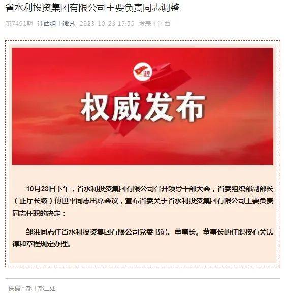 鄒洪同志任江西省水利投資集團有限公司黨委書記、董事長。董事長的任職按有關法律和章程規(guī)定辦理。