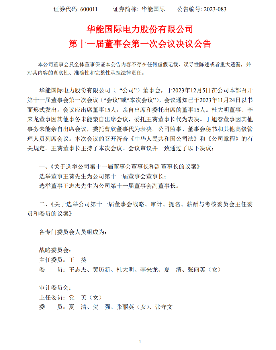 12月6日,華能國(guó)際發(fā)布《華能國(guó)際電力股份有限公司第十一屆董事會(huì)第一次會(huì)議決議公告》(以下簡(jiǎn)稱《公告》)。