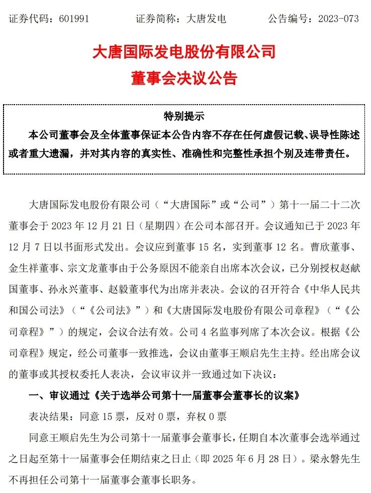 12月21日,大唐國際發(fā)布公告,大唐國際發(fā)電股份有限公司第十一屆二十二次董事會(huì)于12月21日召開,審議通過《關(guān)于選舉公司第十一屆董事會(huì)董事長的議案》,同意王順啟為公司第十一屆董事會(huì)董事長。梁永磐不再擔(dān)任公司第十一屆董事會(huì)董事長職務(wù)。