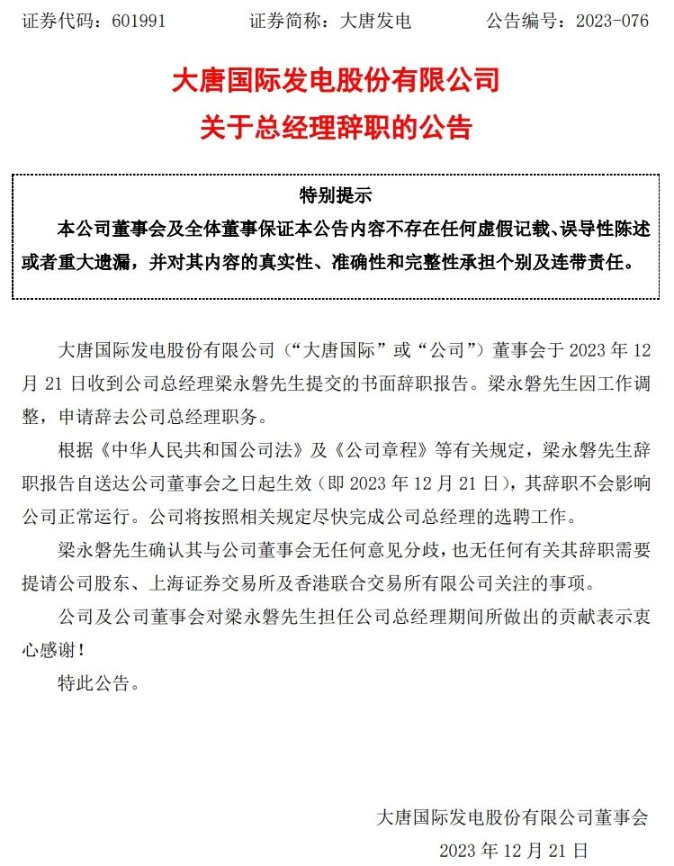 同日,大唐國際發(fā)布總經(jīng)理辭職公告,公司董事會(huì)收到總經(jīng)理梁永磐先生提交的書面辭職報(bào)告。梁永磐先生因工作調(diào)整,申請(qǐng)辭去公司總經(jīng)理職務(wù)。