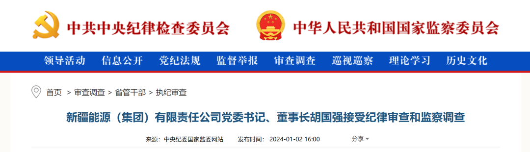 據(jù)中央紀(jì)委國(guó)家監(jiān)委網(wǎng)站1月2日消息,據(jù)新疆維吾爾自治區(qū)紀(jì)委監(jiān)委消息:新疆能源(集團(tuán))有限責(zé)任公司黨委書記、董事長(zhǎng)胡國(guó)強(qiáng)涉嫌嚴(yán)重違紀(jì)違法,目前正接受新疆維吾爾自治區(qū)紀(jì)委監(jiān)委紀(jì)律審查和監(jiān)察調(diào)查。
