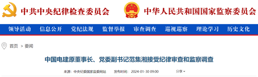 2024年1月30日,據(jù)中央紀委國家監(jiān)委駐國務院國資委紀檢監(jiān)察組、江西省紀委監(jiān)委消息:中國電建原董事長、黨委副書記范集湘涉嫌嚴重違紀違法,接受中央紀委國家監(jiān)委駐國務院國資委紀檢監(jiān)察組和江西省監(jiān)委紀律審查和監(jiān)察調查。