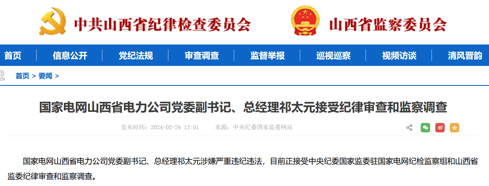 據(jù)中央紀(jì)委國家監(jiān)委網(wǎng)站消息,國家電網(wǎng)山西省電力公司黨委副書記、總經(jīng)理祁太元涉嫌嚴(yán)重違紀(jì)違法,目前正接受中央紀(jì)委國家監(jiān)委駐國家電網(wǎng)紀(jì)檢監(jiān)察組和山西省監(jiān)委紀(jì)律審查和監(jiān)察調(diào)查。