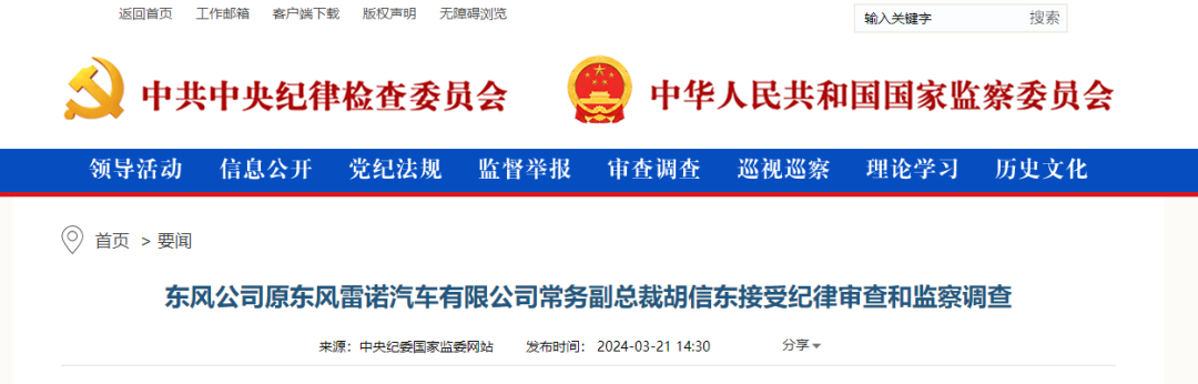 中央紀(jì)委國(guó)家監(jiān)委網(wǎng)站3月21日,據(jù)東風(fēng)公司紀(jì)委、湖北省紀(jì)委監(jiān)委消息:東風(fēng)公司原東風(fēng)雷諾汽車有限公司常務(wù)副總裁胡信東涉嫌嚴(yán)重違紀(jì)違法,目前正在接受東風(fēng)公司紀(jì)委和湖北省襄陽(yáng)市監(jiān)委紀(jì)律審查和監(jiān)察調(diào)查。