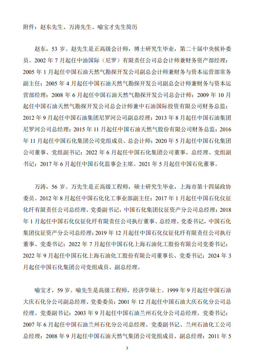此外,按照《公司章程》的規(guī)定,根據(jù)總裁提名,董事會聘任萬濤先生、喻寶才先生為中國石化高級副總裁,聘期自董事會批準之日起至第八屆董事會任期屆滿時止。