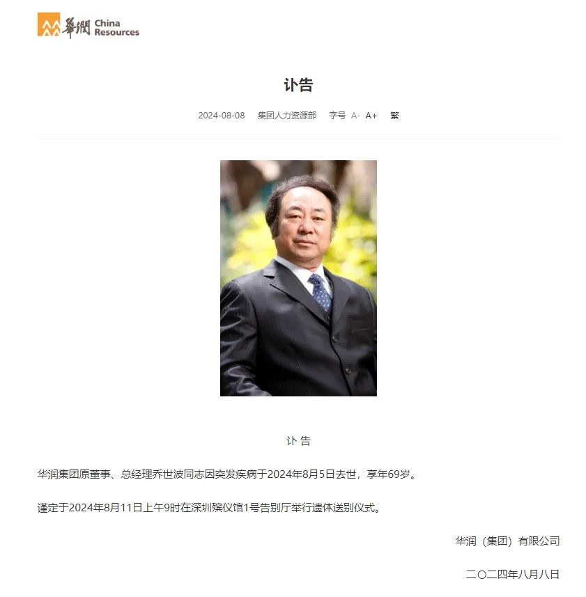 2024年8月5日,華潤(rùn)集團(tuán)原董事、總經(jīng)理喬世波因突發(fā)疾病去世,享年69歲。其遺體送別儀式定于8月11日上午9時(shí)在深圳殯儀館1號(hào)告別廳舉行。