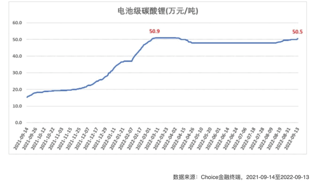 此外,此輪新能源汽車的價(jià)格上漲還和新能源汽車上游原材料價(jià)格的上漲有關(guān)。目前,中國市場電池級碳酸鋰價(jià)格已從2021年初的6萬元/噸上漲到近期的50萬元/噸。