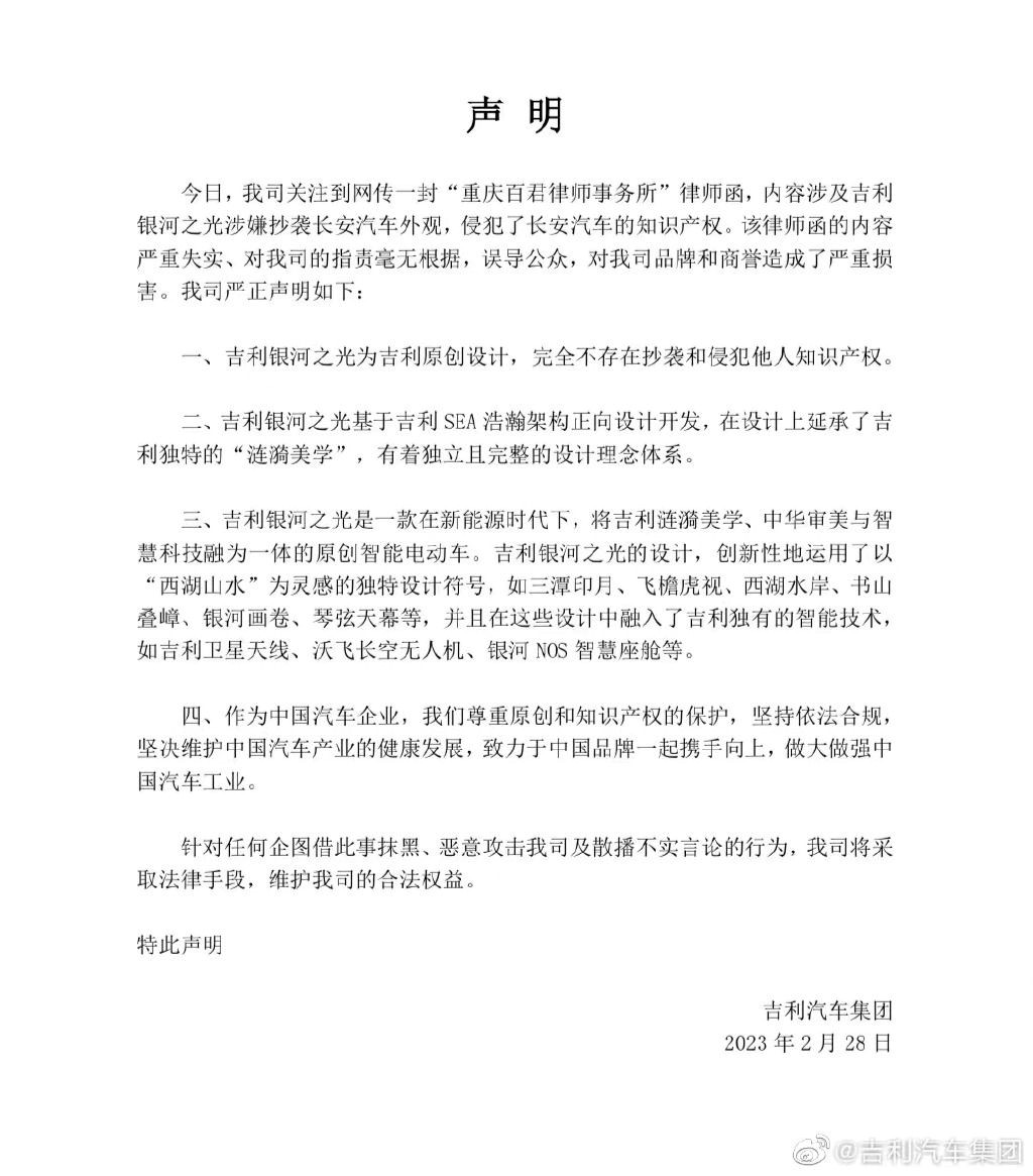 針對抄襲傳聞,吉利汽車直斥上述律師函“內(nèi)容嚴重失實、指責(zé)毫無根據(jù),誤導(dǎo)公眾,對我司品牌和商譽造成了嚴重損害。”根據(jù)吉利汽車2月28日發(fā)布的聲明,吉利銀河之光為吉利原創(chuàng)設(shè)計,完全不存在抄襲和侵犯他人知識產(chǎn)權(quán)。