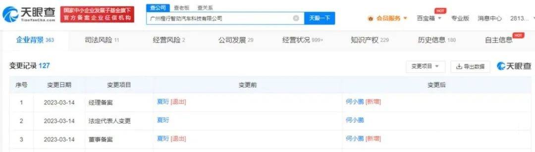 根據(jù)天眼查App顯示,近日,廣州橙行智動汽車科技有限公司發(fā)生工商變更,夏珩卸任法定代表人、執(zhí)行董事、經(jīng)理,由何小鵬接任。不久前,夏珩已接連卸任廣東小鵬汽車科技有限公司、廣州小鵬汽車科技有限公司職務,并均由何小鵬接任。