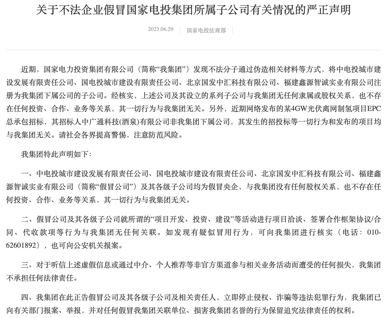 6月29日,國家電投發(fā)布“打假”聲明