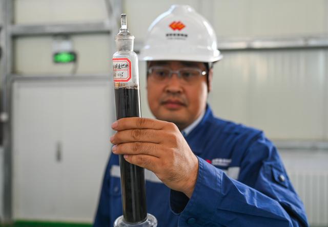 7月7日,國能準能集團煤基納米碳氫燃料車間主任甄鵬在展示該燃料的樣品。