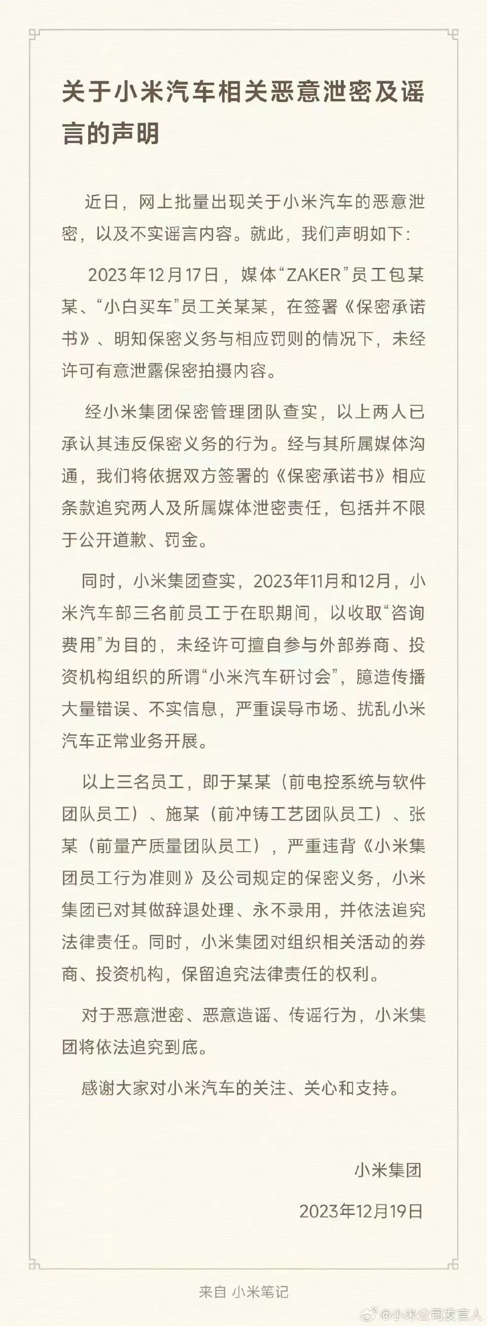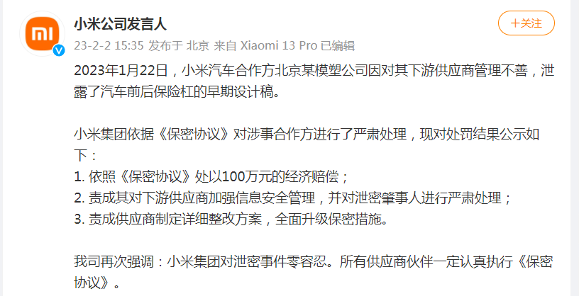 《聲明》稱,2023年12月17日,媒體“ZAKER”員工包某某、“小白買車”員工關某某,在簽署《保密承諾書》、明知保密義務與相應罰則的情況下,未經(jīng)許可有意泄露保密拍攝內(nèi)容。經(jīng)小米集團保密管理團隊查實,以上兩人已承認其違反保密義務的行為。經(jīng)與其所屬媒體溝通,小米集團將依據(jù)雙方簽署的《保密承諾書》相應條款追究兩人及所屬媒體泄密責任,包括并不限于公開道歉、罰金。另外,《聲明》介紹,2023年11月和12月,小米汽車部三名前員工于在職期間,以收取“咨詢費用”為目的,未經(jīng)許可擅自參與外部券商、投資機構組織的所謂“小米汽車研討會”,臆造傳播大量錯誤、不實信息,嚴重誤導市場、擾亂小米汽車正常業(yè)務開展。以上三名員工,即于某某(前電控系統(tǒng)與軟件團隊員工)、施某(前沖鑄工藝團隊員工)、張某(前量產(chǎn)質(zhì)量團隊員工),嚴重違背《小米集團員工行為準則》及公司規(guī)定的保密義務,小米集團已對其做辭退處理、永不錄用,并依法追究法律責任。同時,小米集團表示,對組織相關活動的券商、投資機會,保留追究法律責任的權利。小米汽車始終吸引市場高度關注,這也不是小米集團第一次遭遇汽車泄密。今年1月22日,小米汽車合作方北京某模塑科技有限公司因?qū)ζ湎掠喂坦芾聿簧?,泄露了小米汽車前后保險杠的早期設計稿。“小米公司發(fā)言人”微博今年2月更新了該泄密事件的處理結果:小米集團表示,已依據(jù)《保密協(xié)議》對涉事合作方進行了嚴肅處理,包括依照《保密協(xié)議》處以100萬元的經(jīng)濟賠償;責成其對下游供應商加強信息安全管理,并對泄密肇事人進行嚴肅處理;責成供應商制定詳細整改方案,全面升級保密措施。