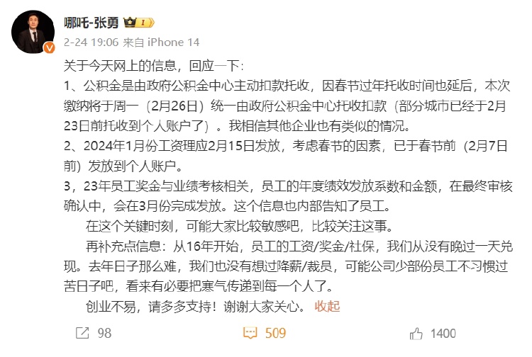 澎湃新聞注意到,春節(jié)復工后,多位員工在脈脈平臺爆料稱,此前哪吒汽車的CEO張勇承諾年后上班第一周發(fā)放年終獎卻并未兌現(xiàn),人事部門經(jīng)理在群內(nèi)通知稱,年終獎延遲到3月發(fā)放。該事經(jīng)發(fā)酵后,張勇在個人微博進行了回應。