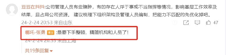 值得一提的是,在該條微博評論區(qū),張勇對有網(wǎng)友建議“梳理組織架構及管理人員編制,把能力不匹配的先優(yōu)化掉”的評論進行了回復,其表示,“是要下手整頓,精簡機構和人員了。”