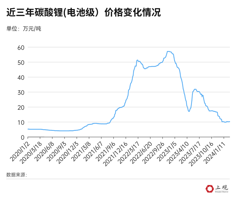 來(lái)自市場(chǎng)的壓力,顯然影響到了比亞迪對(duì)全年車市的預(yù)判,降價(jià)水到渠成。降價(jià)的“血條”還很厚好在,相比燃油車,新能源車的成本在不斷下降,這其中,最主要的是電池原材料碳酸鋰價(jià)格的下跌。這要?dú)w功于前幾年高利潤(rùn)驅(qū)動(dòng)下全球鋰礦資源被大規(guī)模開發(fā),整體產(chǎn)量維持高位,導(dǎo)致供應(yīng)過(guò)剩,價(jià)格下跌。根據(jù)中國(guó)汽車動(dòng)力電池產(chǎn)業(yè)創(chuàng)新聯(lián)盟的數(shù)據(jù),去年前九個(gè)月,動(dòng)力電池的產(chǎn)量達(dá)到533.7GWh,但裝車量不到一半,有超過(guò)270GWh的電池入庫(kù),產(chǎn)量遠(yuǎn)高于需求。
