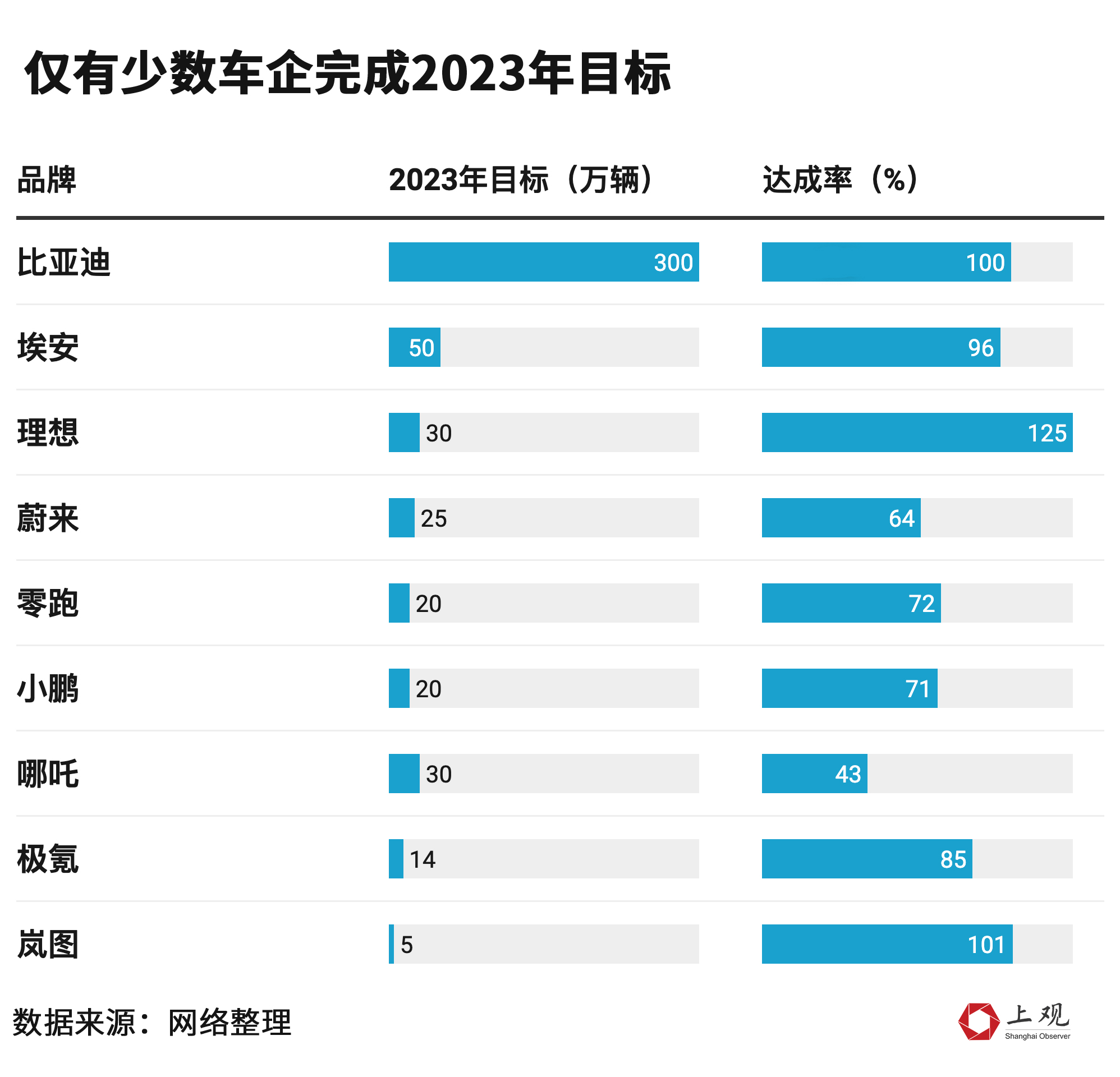 以此估算,2023年新能源汽車的產(chǎn)能利用率僅在57.47%。一般而言,產(chǎn)能正常的標(biāo)準(zhǔn)為79%至83%,低于79%,為產(chǎn)能過(guò)剩。也就可以理解,為何2023年大多數(shù)車企的銷量遠(yuǎn)不及預(yù)期。根據(jù)各企業(yè)的公告,2023年,僅有少數(shù)品牌如比亞迪、理想達(dá)到銷售目標(biāo)。