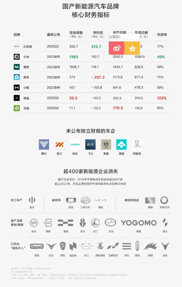就是過去五年來,內(nèi)卷加速“品牌淘汰”,大批造車企業(yè)消亡。據(jù)不完全統(tǒng)計(jì)僅在2018年-2023年五年間,銷聲匿跡的國產(chǎn)新能源品牌就超過400家,新能源這場大逃殺的淘汰了高達(dá)90%。而細(xì)細(xì)分析,這400多家品牌或多或少有著一些共性:小品牌、高負(fù)債、靠資本輸血、資金實(shí)力差。