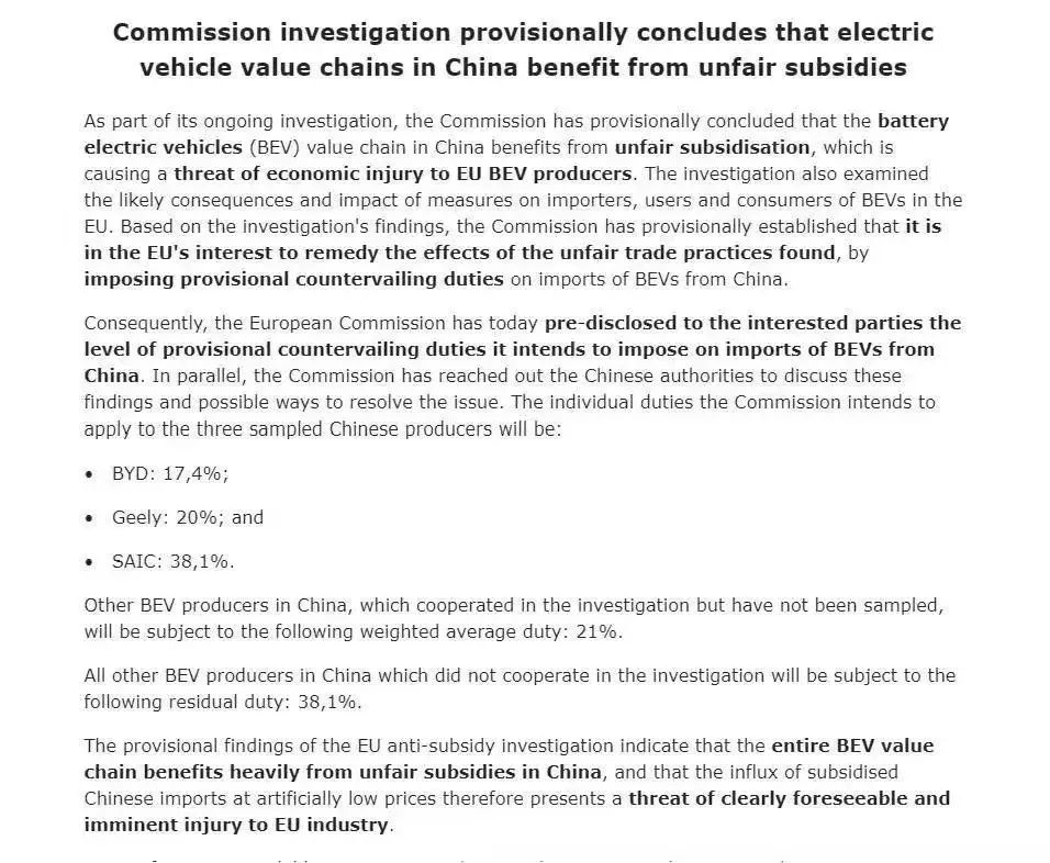 歐盟委員會公告發(fā)布后,商務部新聞發(fā)言人也表態(tài)稱,歐委會罔顧中國電動汽車優(yōu)勢來自開放競爭的客觀事實,罔顧世貿(mào)組織規(guī)則,罔顧中國相關企業(yè)對有關調(diào)查的全面配合,人為構(gòu)造并夸大所謂的“補貼”項目,濫用“可獲得事實”規(guī)則,裁出畸高的補貼幅度,是赤裸裸的保護主義行為,是制造并升級貿(mào)易摩擦,是以“維護公平競爭”為名行“破壞公平競爭”之實,是最大的“不公平”。中方將密切關注歐方后續(xù)進展,并將堅決采取一切必要措施,堅定捍衛(wèi)中國企業(yè)的合法權(quán)益。