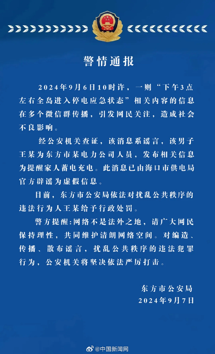 經(jīng)公安機(jī)關(guān)查證,該消息系謠言,該男子王某為東方市某電力公司人員,發(fā)布相關(guān)信息為提醒家人蓄電充電。目前,東方市公安局依法對擾亂公共秩序的違法行為人王某給予行政處罰。