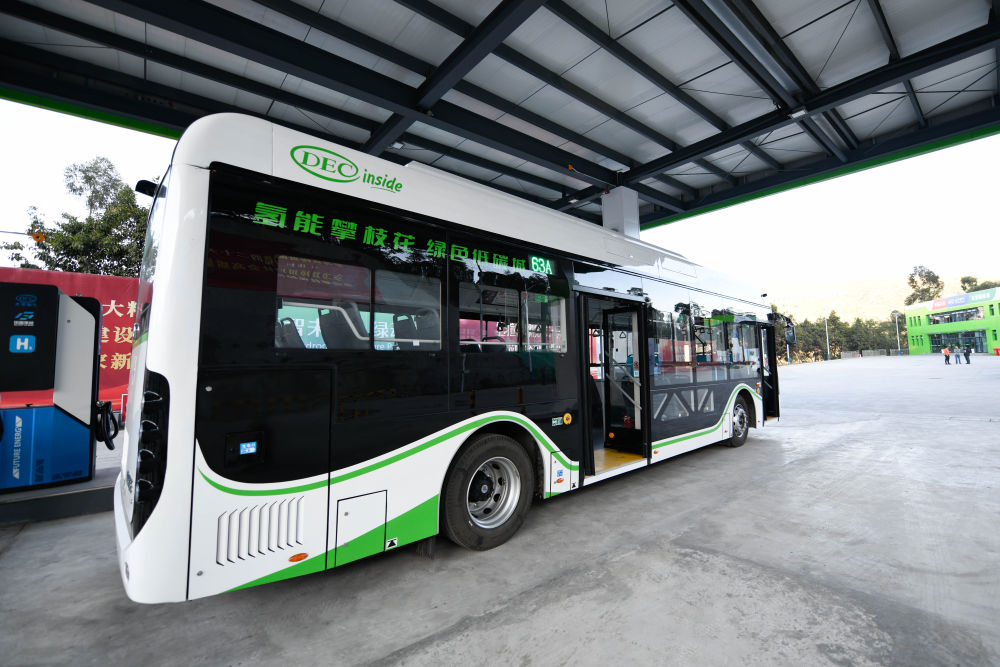 停靠在攀枝花加氫站的氫能公交車(2022年11月27日攝)。新華社記者 胥冰潔 攝