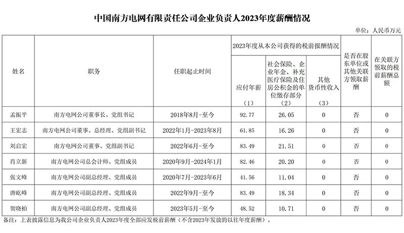 中國南方電網有限責任公司企業(yè)負責人2023年度薪酬情況的表格詳細列出了幾位高層管理人員的姓名、職務、任職起止時間以及他們的薪酬構成。