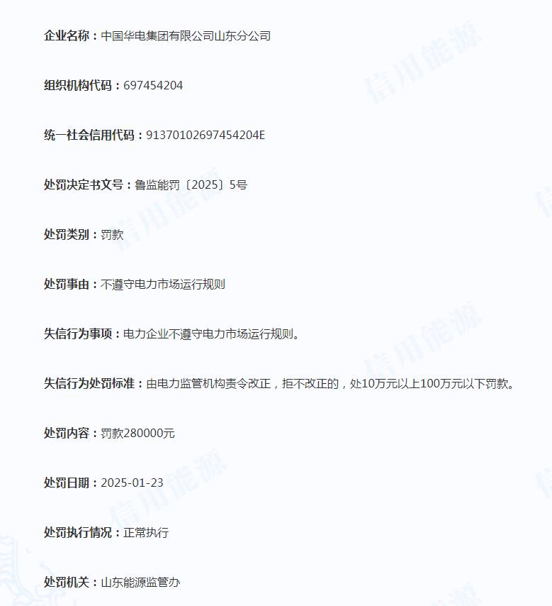 日前,信用能源公布了對(duì)中國(guó)華電集團(tuán)有限公司山東分公司的行政處罰決定,魯監(jiān)能罰〔2025〕5號(hào)處罰決定書文號(hào)顯示,中國(guó)華電集團(tuán)有限公司山東分公司不遵守電力市場(chǎng)運(yùn)行規(guī)則,山東能源監(jiān)管辦對(duì)其作出罰款280000元處罰。
