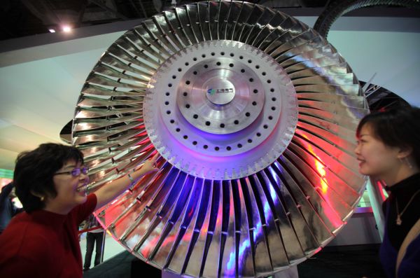 2009年10月4日,觀眾在北京展覽館觀看具有世界先進(jìn)水平的百萬(wàn)千瓦超超臨界發(fā)電機(jī)組中的金屬葉片。