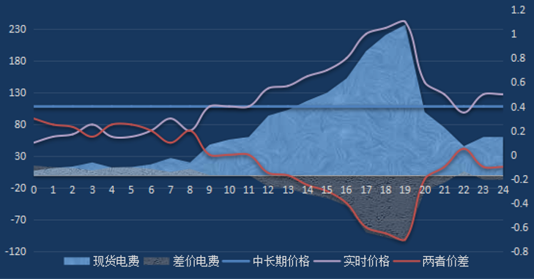 蒙西電力市場(chǎng)的結(jié)算公式是完全符合標(biāo)準(zhǔn)集中式市場(chǎng)設(shè)計(jì)和國(guó)際經(jīng)驗(yàn)的結(jié)算方式,這一點(diǎn)是具有基本電力經(jīng)濟(jì)學(xué)常識(shí)的研究者共同認(rèn)可的事實(shí)。集中式市場(chǎng)的基本特點(diǎn)就是全電量競(jìng)價(jià),通過差價(jià)合約避險(xiǎn),即在現(xiàn)貨市場(chǎng)里購(gòu)買全部要使用或者生產(chǎn)的電量,要按照現(xiàn)貨市場(chǎng)的價(jià)格進(jìn)行結(jié)算,形成電力現(xiàn)貨電費(fèi)。場(chǎng)外簽訂的差價(jià)合約,是締約雙方進(jìn)行避險(xiǎn)的工具,雙方并不是物理意義上買賣電的關(guān)系,只需要雙方認(rèn)可按照合同價(jià)格和某一參考結(jié)算點(diǎn)的現(xiàn)貨價(jià)格之差進(jìn)行付費(fèi)即可,如果價(jià)差為負(fù)則是合同的賣方向買方支付費(fèi)用,如果價(jià)差為正則是合同的買方向賣方支付費(fèi)用。無(wú)論電源在現(xiàn)貨市場(chǎng)中發(fā)電多少、發(fā)沒發(fā)電,差價(jià)合約都要正常結(jié)算。如果不考慮輔助服務(wù)和容量電費(fèi),現(xiàn)貨市場(chǎng)中的結(jié)算電費(fèi)和差價(jià)合約結(jié)算的價(jià)差電費(fèi)就構(gòu)成了發(fā)電企業(yè)的最終結(jié)算電費(fèi)。只要發(fā)電企業(yè)自身沒有申報(bào)負(fù)價(jià),原則上該發(fā)電企業(yè)每個(gè)時(shí)段中標(biāo)電量的現(xiàn)貨電費(fèi)都是正值,但是價(jià)差電費(fèi)是否為正不能確定,因?yàn)槿Q于合同價(jià)格和參考結(jié)算點(diǎn)價(jià)格之間的高低關(guān)系?,F(xiàn)貨電費(fèi)加價(jià)差電費(fèi)確實(shí)可以是負(fù)值。從圖1可以看出,該電源現(xiàn)貨電費(fèi)為天藍(lán)色區(qū)域,面積即為現(xiàn)貨電費(fèi)數(shù)量,為正值,但是價(jià)差電費(fèi)在(差價(jià)合同結(jié)算)0-11時(shí)、22時(shí)不為負(fù),其他時(shí)段均為負(fù),好在天藍(lán)色區(qū)域面積加上為正的灰色面積大于為負(fù)的灰色面積,該電源當(dāng)天電費(fèi)結(jié)算的總額仍然是正值,這是蒙西市場(chǎng)大部分電源電費(fèi)結(jié)算的示意圖。那么大烏海區(qū)域的部分發(fā)電企業(yè)為何會(huì)發(fā)生“付錢發(fā)電”的情況呢?