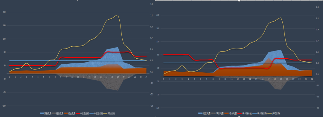 當(dāng)市場(chǎng)來(lái)臨的時(shí)候,部分國(guó)有發(fā)電企業(yè)的經(jīng)營(yíng)模式并沒有調(diào)整到位,可能存在經(jīng)營(yíng)決策失誤的原因。例如,中長(zhǎng)期簽約時(shí)未充分考慮自身節(jié)點(diǎn)和用戶側(cè)現(xiàn)貨價(jià)格的差異,不同發(fā)電企業(yè)、不同用戶一個(gè)策略,簡(jiǎn)單粗暴,不管簽?zāi)牡挠脩舳际且粋€(gè)價(jià),只重視合同價(jià)格的高低,不考慮價(jià)差電費(fèi)的高低,有些甚至不在合同中約定分時(shí)價(jià)格。如圖4所示,左圖與右圖用戶電量相同,左圖用戶合同價(jià)為0.4元/度,右圖用戶合同價(jià)為0.3元/度,兩個(gè)用戶用電曲線形狀不同,其他均相同。從大烏海區(qū)域部分電源的選擇來(lái)看,顯然更喜歡左圖用戶,然而事實(shí)卻告訴我們:由于右圖用戶價(jià)差電費(fèi)要遠(yuǎn)高于左圖用戶的價(jià)差電費(fèi),最終的結(jié)算結(jié)果是合同價(jià)低25%的右圖用戶可以為電源帶來(lái)的電費(fèi)(紅色部分)高于左圖用戶。